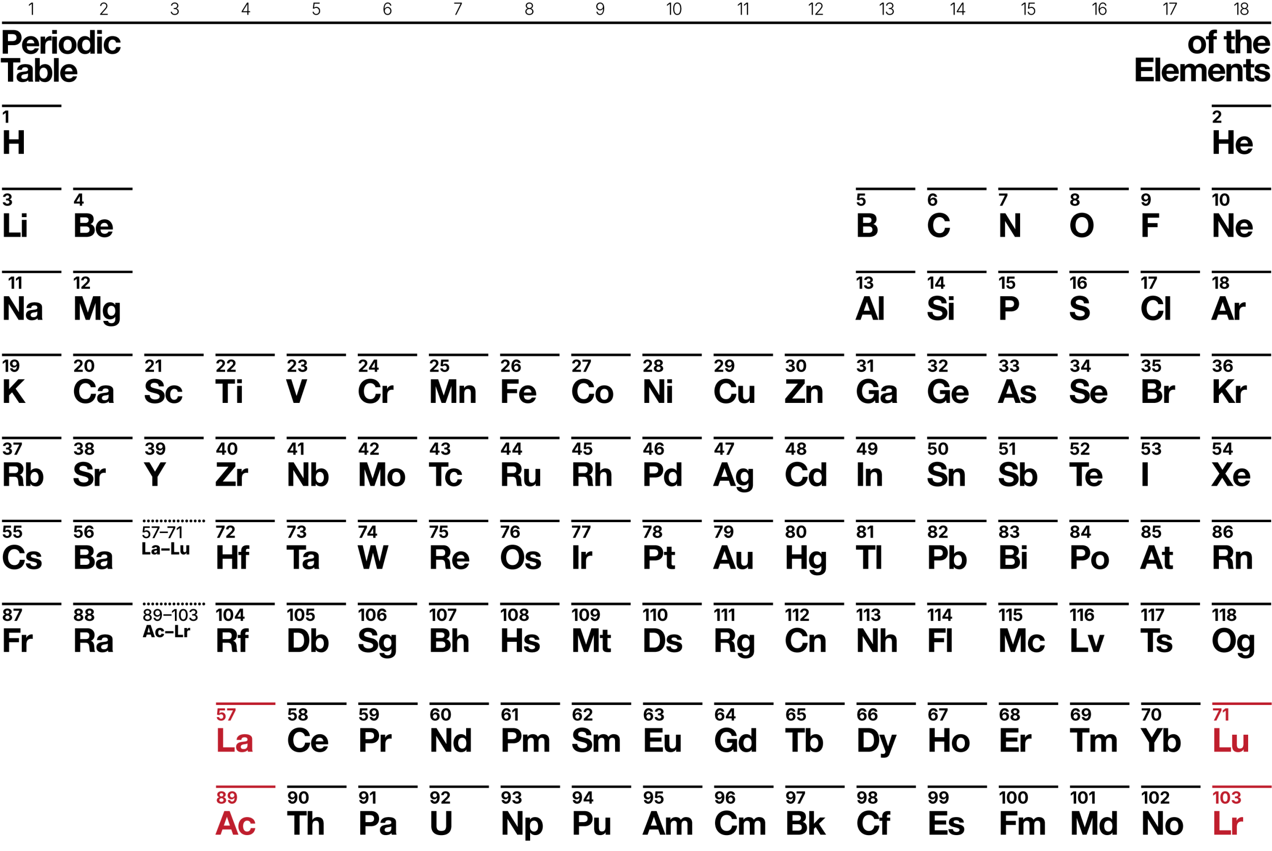 1. The positions of lanthanum (La), actinium (Ac), lutetium (Lu), and lawrencium (Lr) are highlighted in the periodic table below (Retrieved from https://www.acs.org/content/acs/en/education/whatischemistry/periodictable.html). This periodic table avoids putting either La, Ac or Lu, Lr in group 3 by presenting a 15-column f-block. Many argue that although such arrangement circumvents the debate, it does not fundamentally solve the issue and can still cause confusion.